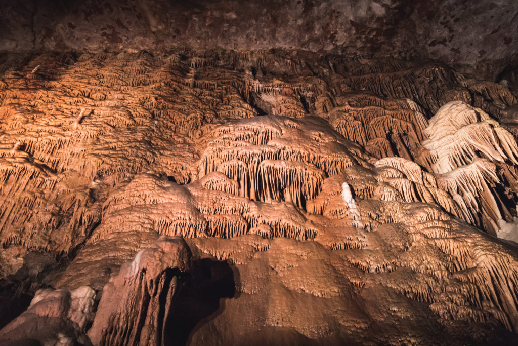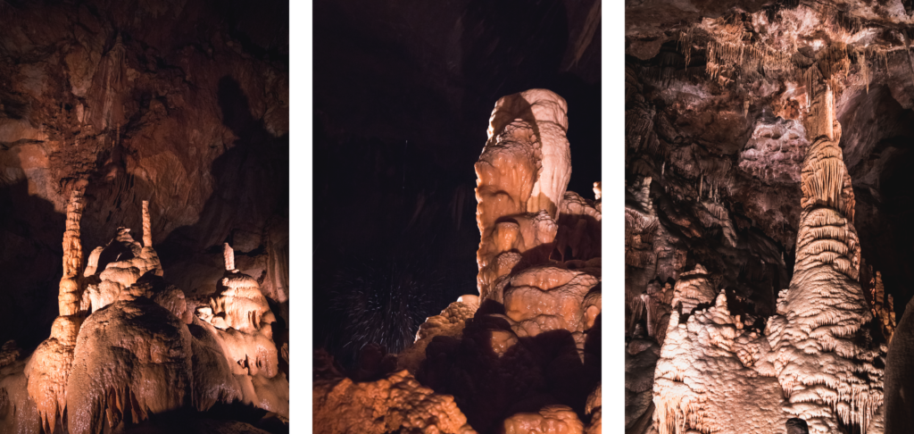 Mais le spectacle ne s’arrête pas là ! Nous avons eu la chance d’avoir une visite guidée et privée de la grotte. L’enthousiasme de notre guide est palpable ! On sent qu’elle est ravie de nous faire découvrir les lieux et de partager ses connaissances avec nous. Elle nous apprend notamment qu’un tout nouveau système d’éclairage au led dynamique a été installé dans la grotte, ce dernier n’altère pas la couleur naturelle de la roche, ce qui permet de vraiment mettre en valeur les différentes formations géologiques. Les salles sont éclairées par ses soins au fur et à mesure que nous avançons dans la grotte. Quand une nouvelle partie est mise en lumière, la précédente se plonge dans l’obscurité la plus totale, comme par magie.